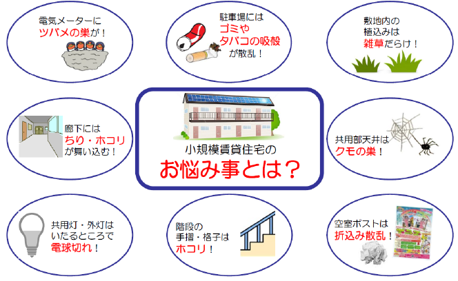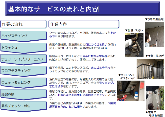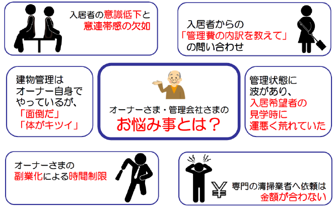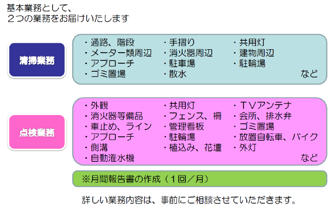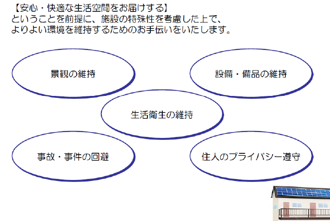 そのようなことのないよう、住人の皆さまが安全・安心清潔な環境で生活いただける、また新しく入居を検討される方へのよい印象を与えることのできる環境づくりのお手伝いをさせていただくパートナーとして、ご満足いただけるサポートをお約束いたします。